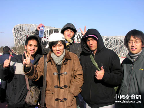 中国台湾网1月23日北京消息 23日是08台胞青年冬令营开营后活动的第一天。北京的冽冽寒风挡不住台湾学子的高涨热情,面对奥运场馆“鸟巢”和“水立方”,台胞青年兴奋雀跃,惊呼震撼,深感自豪。