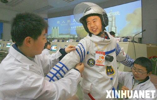 1月24日,东高地三中初一年级的学生付义南在试穿“宇航服”,和同学们一起免费体验东高地青少年科技馆的航天科普活动。当日,北京市丰台区东高地街道正式启动“奥运牵手”工程,专门制作发放3000余张“奥运牵手卡”给辖区内的学生,寒假期间,学生将和父母亲一起持卡到社区登记,参加社区奥运志愿服务活动,按照服务的时间长短,社区进行登记“积分”,以评选“奥运贡献奖”。据了解,凡持“奥运牵手卡”的学生,可以免费参加东高地青少年科技馆的航天科普活动、享受优惠价参观中华航天博物馆,到“社区绿色科普活动站”免费借阅图书和光盘。
