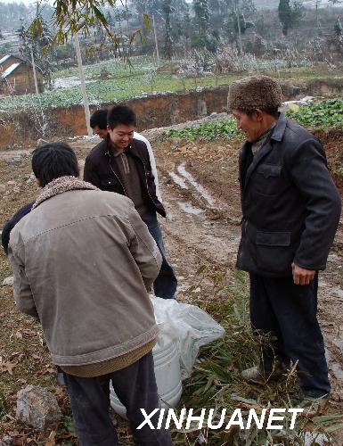 2月6日,李彬(中)在为永温乡灾民送救灾物资。34岁的贵阳市开阳县永温乡纪委书记李彬,除夕之夜因操劳过度,突发脑溢血猝然病倒。经过两次开颅手术后,截至记者发稿时,李彬仍处于深度昏迷状态,生命垂危。新华社记者周之江摄