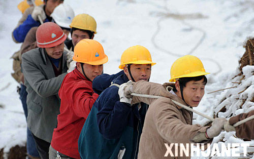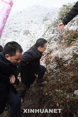 2月5日,中共中央政治局常委、国务院总理温家宝前往贵州指导抗灾救灾工作。这是温家宝踏着冰雪登上黔南观音山,前去看望正在紧张抢修输电线路的电力工人。新华社记者 姚大伟 摄