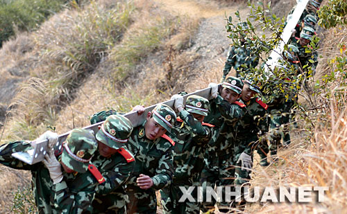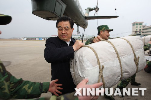 2月5日至6日,中共中央总书记、国家主席、中央军委主席胡锦涛来到广西桂林市考察抗灾救灾工作。这是胡锦涛同正在执行救灾任务的广州军区某集团军陆航团的官兵一起装运救灾物资。新华社发