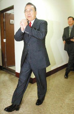 对媒体披露陈水扁当局秘密成立鐽震公司进行军火买卖,台当局“国防部长”李天羽(左)在“立委”要求下,上午低调紧急赴“立法院”国民党团说明。台湾《联合晚报》记者林俊良摄