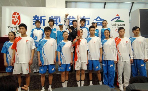 1月16日,模特在展示火炬接力服装。当日,北京奥运会火炬接力形象景观在北京奥运新闻中心公布。北京奥运会火炬接力形象景观以奥运五环、火炬接力标志、主题口号、核心图形和色彩为基础元素,以凤纹、祥云、中国红为创意来源,充分体现奥林匹克精神与中国文化的结合,具有强烈的时代特色。 新华社记者 罗晓光 摄
