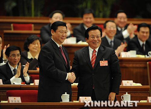3月15日,十一届全国人大一次会议在北京人民大会堂举行第五次全体会议,选举第十一届全国人民代表大会常务委员会委员长、副委员长、秘书长;选举第十一届全国人民代表大会常务委员会委员;选举中华人民共和国主席、副主席;选举中华人民共和国中央军事委员会主席。这是习近平当选中华人民共和国副主席后,曾庆红与习近平握手。 新华社记者李学仁摄