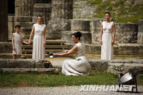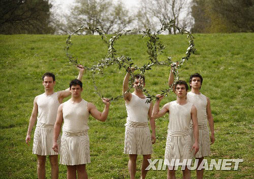 3月23日,扮演男祭司的演员们在彩排仪式上举起五环。当日,北京奥运会圣火采集仪式在奥林匹亚进行最后一次彩排。新华社记者毕明明摄