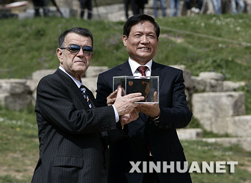 3月24日,希腊奥委会主席米诺斯·基里亚库(左)在希腊古奥林匹亚遗址向中共中央政治局委员、中共北京市委书记、北京奥组委主席刘淇赠送纪念品。当日,北京奥运圣火取火仪式在希腊古奥林匹亚遗址举行。 新华社记者李岳摄