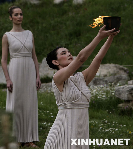 3月24日,北京奥运会圣火取火仪式在希腊奥林匹亚举行。图为最高女祭司举起火种罐。 新华社记者李岳摄