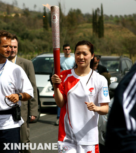 3月24日,中国火炬手罗雪娟(右)在火炬传递过程中。 新华社记者毕明明摄