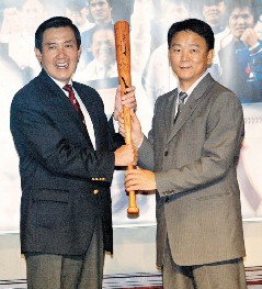 中国台北棒球队总教练洪一中致赠全队签名球棒给马英九,教练团和到场的19名球员,也和马英九合影留念。马英九表示,很感动看到中国台北棒球队卓越表现,奥运资格赛期间,刚好碰到“大选”辩论,两位候选人都有提到棒球,“如果有机会,还会在休息室偷偷看一下,打到第几局”,可见大家都非常关心球赛,中国台北棒球队的表现让民众感到光荣。