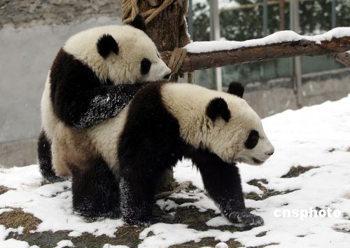 资料图:赠台大熊猫团团、圆圆在雪地里嬉戏。 中新社发 王瑞林 摄