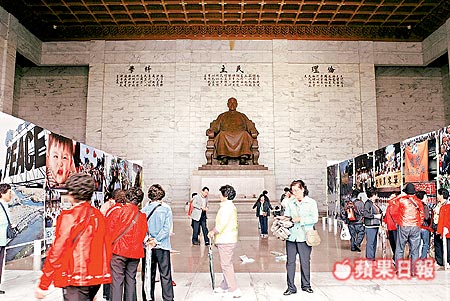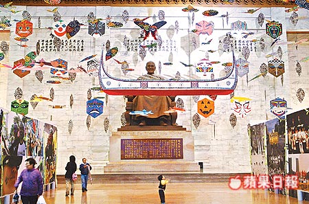 中国台湾网4月2日消息 据台湾媒体报道,昨天早上9时中正纪念堂(已更名为“台湾民主纪念馆”)的大门一开,被风筝、兰屿拼板舟“困”了三个月的蒋介石铜像终于“重见天日”,但两旁的展板依然高挂。