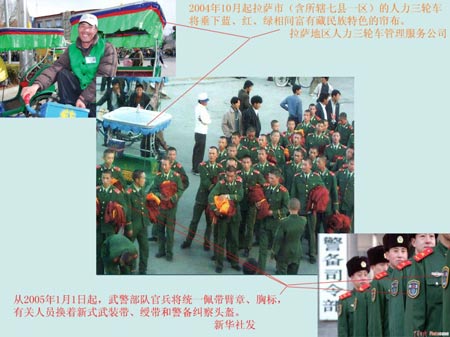 首先,图中并不是中国的军队而是武警部队;其次,根据新华社2004年的消息,2004从2005年1月1日起,武警部队官兵将统一佩带臂章、胸标,而照片中的武警战士没有佩戴臂章、胸标,说明这张照片至少拍摄于2005年之前;另一个事实是,根据西藏商报2004年10月的消息,从2004年10月13日起,拉萨市的人力三轮车将统一使用蓝、红、绿相间富有藏民族特色的帘布,而图中的三轮车帘布的颜色使用的还是蓝色帘布,说明这张照片拍摄的时间不可能拍摄于2004年11月之后。