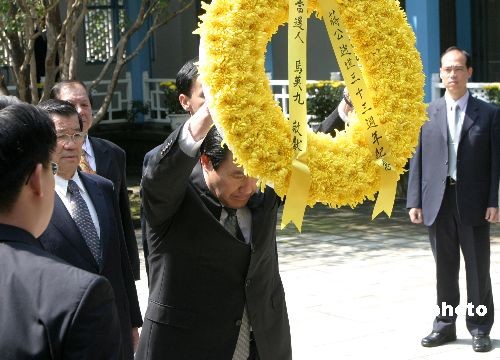 上午十时三十分许,当选台湾地区领导人的马英九在谒陵完毕后,来到慈湖纪念雕塑公园。在上千人的注目下,马英九、桃园县长朱立伦等人为全台最大的蒋介石铜像揭幕。这尊坐姿铜像以前摆放于高雄市文化中心,在去年“去蒋风波”中被大卸二百多块,如今大致修复,然残缺部位依然清晰可见。