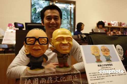 4月5日,“两蒋”Q版公仔亮相慈湖旅游季系列活动开幕仪式。新版的“两蒋”公仔,取名完全颠覆那个严肃的年代,叫做蒋大头跟蒋小国,Q版的存钱筒,强调纯手工,有大小两种尺寸,在慈湖两蒋游客中心展示后众多游客表示要预定。图为“两蒋”公仔和设计师TERRY一起。 中新社发 杜洋 摄