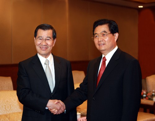 4月12日,中共中央总书记胡锦涛在海南省博鳌会见萧万长先生率领的台湾两岸共同市场基金会代表团一行。 新华社记者鞠鹏摄