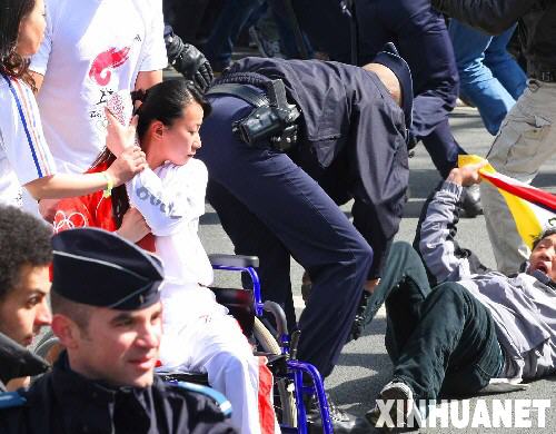 这是4月7日拍摄的奥运火炬手金晶在北京奥运会火炬接力巴黎站的传递活动中奋力保护火炬。金晶,这位被网友们称为“轮椅上的微笑天使”、“最美丽的火炬手”的27岁女孩,是来自上海的残疾人击剑运动员,在7日巴黎奥运火炬传递过程中她用身体奋力保护火炬。 新华社发(贾婷摄)