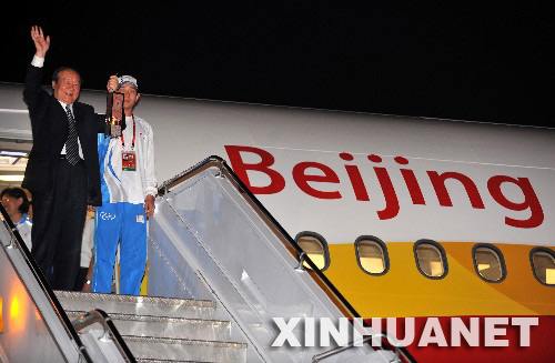 4月16日,北京奥组委执行副主席蒋效愚手持火种灯走出机舱。 当日,运送北京奥运圣火的专机从阿曼马斯喀特飞抵奥运火炬境外传递的第10站--巴基斯坦首都伊斯兰堡。 新华社记者吕小炜摄