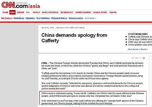 在CNN网站首页中部的“Popular News”栏目中,刊登了《China demands apology from Cafferty(中国要求卡弗蒂道歉)》一文。文章前三段陈述了中国外交部对卡弗蒂言论的指责及要求卡弗蒂道歉的情况,在第四段中这样说:CNN发表了一份声明称:“不论是卡弗蒂先生本人,还是CNN,都无意冒犯中国民众;在这里,我们愿向受到此言论影响的人们道歉。”