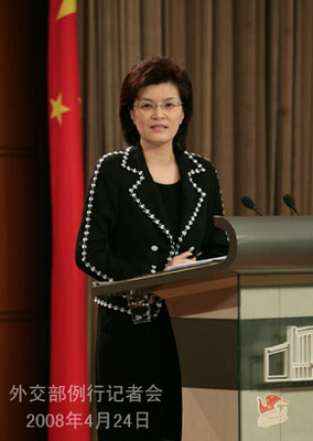 2008年4月24日下午,外交部发言人姜瑜举行例行记者会,就奥运火炬传递、欧洲议会通过涉华决议等回答了记者提问。