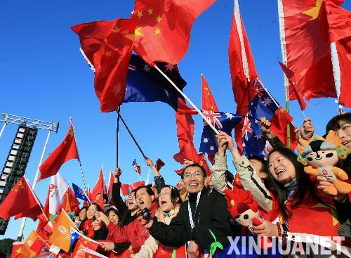 资料图片:4月24日,华人华侨在起跑仪式现场为奥运圣火传递活动加油。当日,北京奥运圣火传递活动在澳大利亚堪培拉举行。新华社记者 李颖 摄