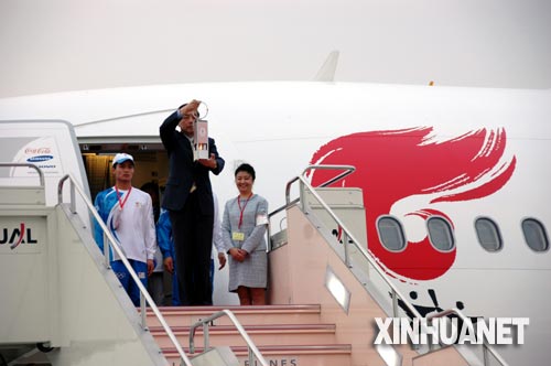 4月25日,北京奥组委执行副主席李炳华手持火种灯走出机舱。当日,北京奥运圣火抵达日本东京。新华社记者 冮冶 摄