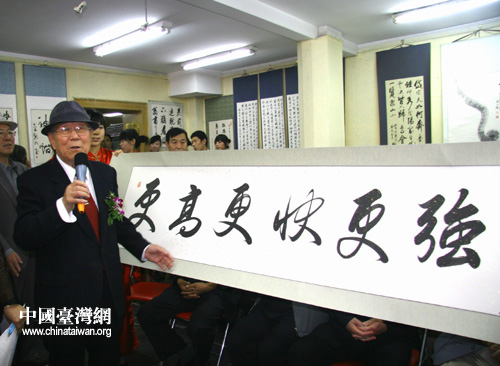 中国台湾网5月8日北京消息 今天上午10点,正值北京奥运圣火首次登上地球之巅珠峰之际,当代著名书法家张仲愈先生的迎奥运书法汇报展在北京荣宝斋开幕。开幕式上,张仲愈先生向北京奥组委捐赠大幅作品“同一个世界 同一个梦想”和一副六尺楹联 “奥运雄风健儿名扬四海;中华盛世英雄功耀九州”;向国际奥委会主席罗格先生赠送一副8尺横幅作品“更快、更高、更强”。