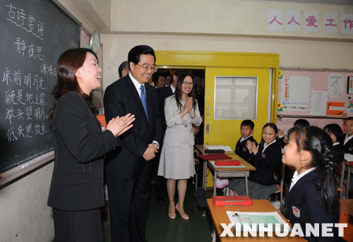 5月9日,国家主席胡锦涛参观横滨山手中华学校。这是胡锦涛同正在上课的小学生亲切交谈。 新华社记者 李学仁 摄