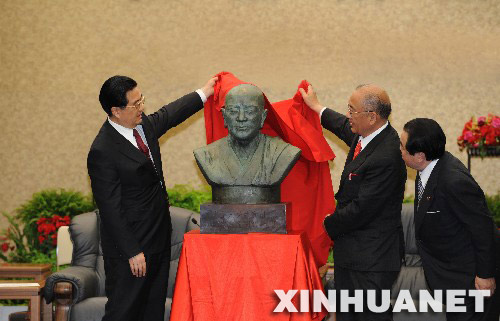 5月10日,国家主席胡锦涛在奈良会见日本奈良县知事荒井正吾,并赠送鉴真塑像。这是胡锦涛主席同荒井正吾为塑像揭幕。 新华社记者黄敬文摄