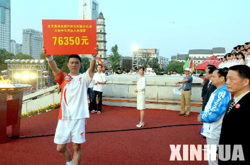 5月17日,最后一棒火炬手马建明代表所有绍兴传递的火炬手,将他们的捐款交给绍兴市民政局。当日,北京奥运会圣火在浙江绍兴传递。 新华社记者王小川摄