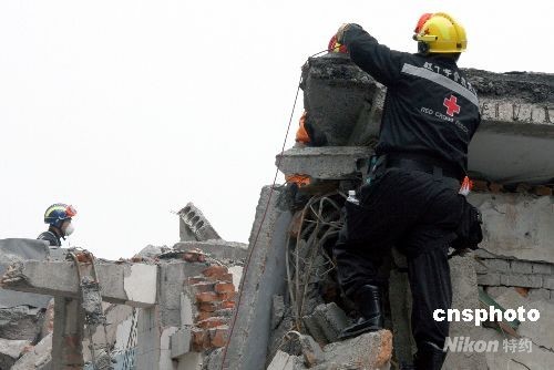来自台湾的红十字救援队,十七日进入四川绵竹市汉旺镇展开搜救工作,图为队员们爬上废墟顶部探测。 中新社发 齐彬 摄