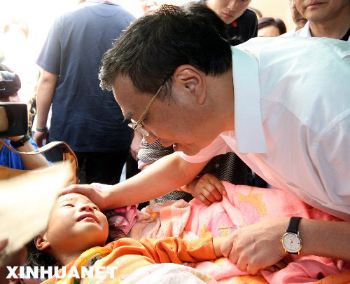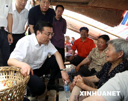 5月18日,受党中央、国务院委托,为贯彻胡锦涛总书记、温家宝总理重要指示,中共中央政治局常委、国务院副总理、国务院抗震救灾总指挥部副总指挥李克强到四川省受灾最严重的绵阳市,指导协调抢险救援和防疫防灾工作。这是李克强在绵阳市平武县平通镇慰问受灾群众。新华社记者兰红光摄