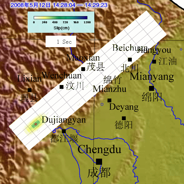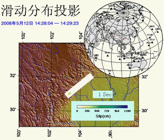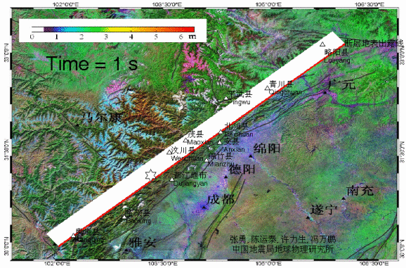 此动画为汶川8.0级地震破裂过程,破裂时间80秒,破裂长度216km,破裂方向为北东229度,方位角为32度,代表断层滑动,颜色深浅代表应力强度。