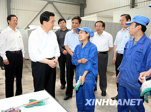 5月25日,中共中央总书记、国家主席、中央军委主席胡锦涛来到河北省廊坊市,实地考察救灾过渡安置房生产情况。这是胡锦涛在雅致集成房屋(廊坊)有限公司板材车间同一线工人亲切交谈。 新华社发 新华网河北廊坊5月25日电(记者孙承斌)妥善安置四川汶川大地震灾区1400多万被转移的受灾群众,是中共中央总书记、国家主席、中央军委主席胡锦涛高度关注的问题。继3天前赴浙江省湖州市考察救灾帐篷生产情况后,胡锦涛又于25日来到河北省廊坊市,实地考察救灾过渡安置房生产情况。 为了让这1400多万受灾群众在恢复重建过程中能够安顿下来,中央决定,在向灾区提供大批救灾帐篷的同时,安排专项资金,为灾区首批建造100万套救灾过渡安置房。 上午10时许,胡锦涛在河北省委书记张云川、代省长胡春华等陪同下,考察了雅致集成房屋(廊坊)有限公司。位于河北廊坊经济技术开发区的这家企业,承担着13500套过渡安置房的生产任务。厂区内,到处码放着生产用的钢材、泡沫板,运送原材料和制成品的货车来来往往,全厂1000多名员工正昼夜不停地加紧生产。 胡锦涛走进焊花飞溅的钢构车间,一边观看生产过程,一边向企业负责人询问情况。生产班次是怎么安排的,原材料有没有保证,生产上还有什么困难……总书记问得十分仔细。他叮嘱企业负责人说,过渡安置房生产任务非常重要,关系抗震救灾工作全局。一定要开足马力,加紧生产,提前完成任务,以实际行动支援抗震救灾斗争。 在板材车间,胡锦涛同几位正在忙碌的工人亲切交谈,代表党中央、国务院向他们表示衷心的感谢。他对大家说,现在受灾群众急需过渡安置房,希望大家抓紧生产,为帮助灾区人民重建家园贡献一份力量。 随后,胡锦涛走进一间搭建好的样板房,认真察看过渡安置房的质量。看到样板房洁净明亮、通风良好,胡锦涛对企业负责人说,过渡安置房一定要确保质量,具备防震、防水、防火、防风和隔热、保温等功能,尽可能改善受灾群众临时住处的居住条件。 离开雅致公司,胡锦涛来到中太建设集团股份有限公司。这家企业承担了6000套过渡安置房的安装任务,目前已有200多名职工在四川地震灾区进行基础施工,还有300多名职工即将奔赴灾区安装过渡安置房。 中太建设集团楼前广场上,铲车、吊车等大型施工设备整齐排列,即将启程的安装救援突击队员精神抖擞、整装待发。胡锦涛走到他们面前,大声对大家说,当前,安置受灾群众已成为抗震救灾最突出的任务,我们面临的最大困难就是缺少临时住房。抓紧建设过渡安置房,就是中央为解决受灾群众临时住房问题作出的重大决策。希望同志们到灾区后,急受灾群众之所急,解受灾群众之所难,争分夺秒,加紧工作,出色完成任务,让受灾群众早日住进“新家”,为夺取抗震救灾胜利作出更大贡献。 总书记为突击队员壮行的这番话,使大家倍感振奋。 在中太建设集团一个会议室里,胡锦涛同河北省、廊坊市有关负责同志和这次考察的两家企业负责人围坐在一起,共同研究搞好过渡安置房建设问题。 在听了大家的情况汇报后,胡锦涛作了重要讲话。他指出,这次四川汶川大地震,给灾区人民群众生命财产造成了巨大损失。在党中央、国务院和中央军委坚强领导下,全国军民紧急动员,打了一场抗震救灾的攻坚战。现在,安置好受灾群众的任务十分艰巨、十分紧迫。中央对承担过渡安置房生产和装配任务的企业寄予厚望,灾区群众也对你们寄予期待。希望你们把受灾群众的困难当作自己的困难,把受灾群众的需要当作自己的需要,全力以赴,日夜奋战,保质保量并力争提前完成任务,为夺取抗震救灾斗争的全面胜利作出积极贡献。 胡锦涛就过渡安置房建设提出四点要求:一是要挖掘生产潜力,克服各种困难,千方百计增加产量,努力完成过渡安置房生产任务。二是要把质量放在首位,符合防震、防火、防水、通风、采光、卫生等方面的设计要求,坚持质量不合格决不出厂。三是要抓紧抢运装配,运输部门要扩大运力、特事特办,优先保证生产出来的过渡安置房第一时间运往灾区;装配企业要及时组织队伍赶赴灾区一线,迅速把过渡安置房装配起来,让受灾群众尽快住进去。四是要加强组织领导,各级政府部门要为过渡安置房生产企业提供服务,帮助这些企业解决原材料供给、零部件配套和流动资金等问题,为他们按期完成中央下达的任务创造有利条件。 胡锦涛强调,当前,要坚持一手抓抗震救灾工作,一手抓经济社会发展。全国各地要大力支援抗震救灾工作,同时要保持经济发展的良好势头、维护社会和谐稳定,这本身就是对灾区人民的有力支持。目前改革发展稳定的任务很重,希望大家努力工作,切实把本地区本部门的事情办好。