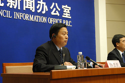 图为新闻发布会主持人郭卫民发布灾区最新情况。中国政府网 张泳摄