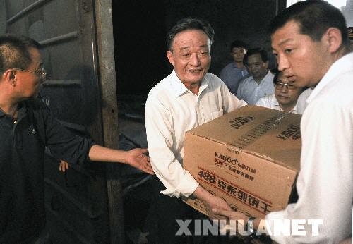 5月26日,中共中央政治局常委、全国人大常委会委员长吴邦国专程赴四川地震灾区,慰问干部群众,看望救援人员,指导抗震救灾工作。这是吴邦国委员长在成都火车东站视察救灾物资转运情况,并搬起一箱食品。 新华社记者黄敬文摄