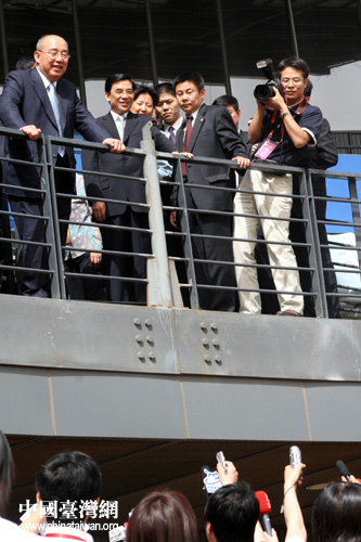 参观棒球场时,吴伯雄表现得相当轻松和兴奋。在听取场馆工作人员介绍时,他频频点头,并不时环顾场地四周,偶尔还微笑着与陪同参访的中共北京市委副书记王安顺低头交流。