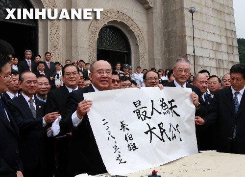 5月27日上午,中国国民党主席吴伯雄率中国国民党大陆访问团在南京拜谒中山陵。这是吴伯雄在完成拜谒中山陵仪式后,挥毫题词“天下为公 人民最大”。新华社记者 庞兴雷 摄