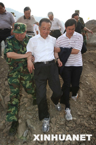 6月5日,中共中央政治局常委、国务院总理、国务院抗震救灾总指挥部总指挥温家宝赴四川察看唐家山堰塞湖的情况。这是温家宝走在坑洼不平的碎石坡上,实地考察、研究堰塞湖涨水及工程排险办法。 新华社记者刘卫兵摄