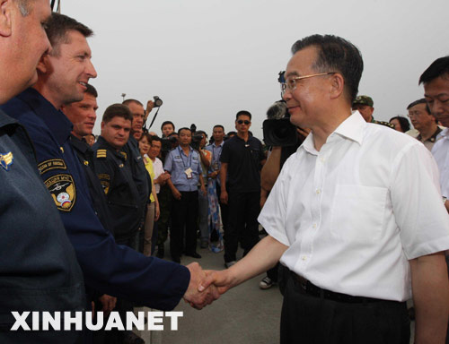 温家宝在机场亲切看望了俄罗斯米-26重型运输直升机机组成员。他说,在我们最艰难的时候,俄罗斯政府派出了救援队、医疗队,运输了大量的物资和器材,特别是在这次处理唐家山堰塞湖的过程中,派出了米-26重型运输直升机。感谢俄罗斯政府、俄罗斯人民,感谢俄罗斯飞行员和俄罗斯的朋友们。