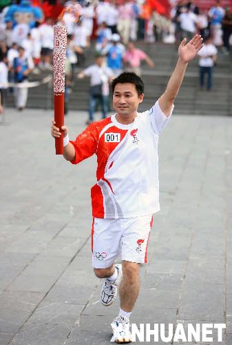 6月6日,第一棒火炬手唐灵生手持火炬传递。当日,北京奥运圣火在广西桂林传递。 新华社记者邢广利摄