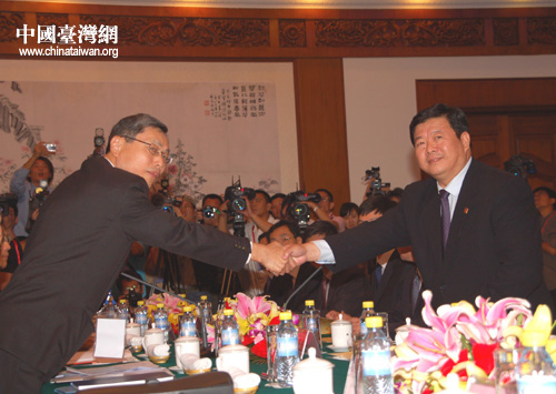 今天上午,海协会与海基会就两岸周末包机议题进行协商。这是海协会执行副会长孙亚夫与海基会副董事长兼秘书长高孔廉在协商前握手。(摄影:中国台湾网 田云鹏)