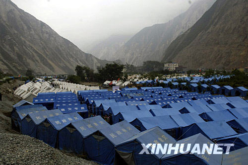 这是6月18日拍摄的汶川县最大的紧急避险安置点——绵虒镇板桥村紧急避险安置点。6月18日,四川汶川县绵虒镇板桥村安置点安置了5000多名从山上紧急撤离下来的群众,以防范次生灾害的威胁。由于汶川县紧急避险采取“边撤退,边搬迁,先入住,后完善”的方法,这里的设施正在逐步完善,以期达到小区生活标准。 新华社记者 海明威 摄