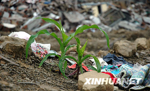 北川县城废墟上已经长出玉米苗(6月16日摄)。 新华社记者 王洋 摄