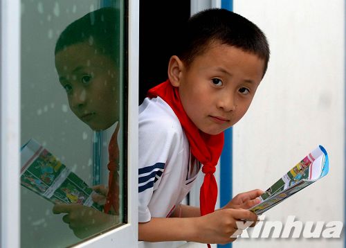 在都江堰市幸福家园安置点,小学生邓煜锐从活动板房内探出身来 新华网记者 岳月伟 摄