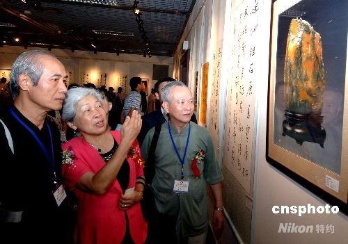 6月19日,由台湾中国书法家学会理事长谢季芸女士(左二)率团的台湾书法界名流二十多人,在福州市博物馆内品味海峡两岸寿山石文化书法精品。当日,海峡两岸寿山石文化书法精品展在此开幕。 中新社发 刘可耕 摄