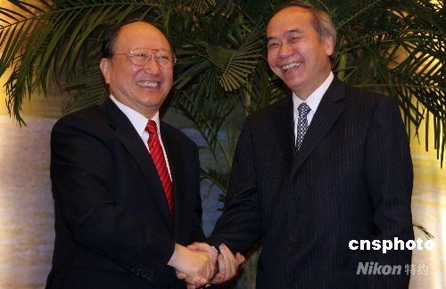 6月23日,中国工程院院长徐匡迪与中国工程院去年新增选院士、台湾高雄长庚纪念医院院长陈肇隆教授(右)相见甚欢。中国科学院第十四次院士大会、中国工程院第九次院士大会当日在北京开幕,陈肇隆专程参会,并在下午举行的中国工程院第九次院士大会全体会议上,获颁该院院士证。 中新社发 孙自法 摄