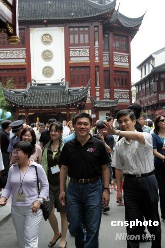 6月25日中午,台北市长郝龙斌一行在上海著名的绿波廊饭店就餐,并逛城隍庙。中新社发 潘索菲 摄