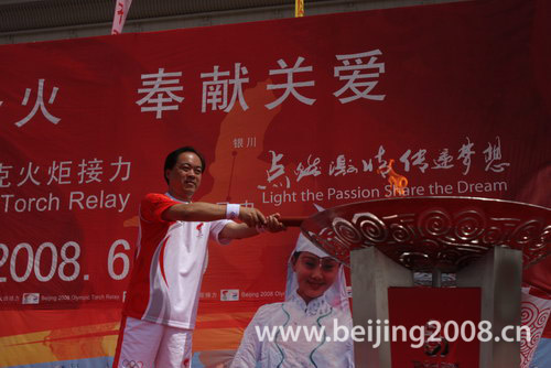 最后一棒火炬手、青铜峡铝业集团有限公司总经理黄河点燃设于盛元广场的圣火盆。(来源:奥运官方网站)