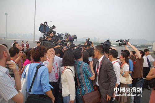 两岸媒体记者在北京首都机场3号停机坪焦急的等待(摄影:钟宝华)