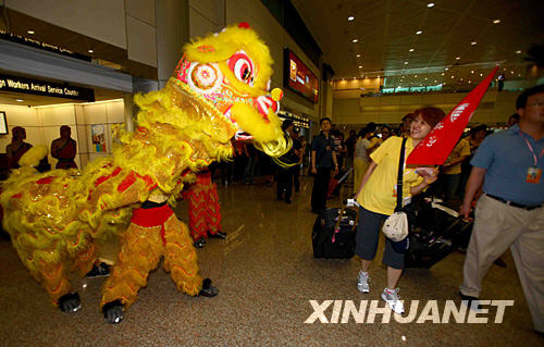 7月4日,来自北京的游客在台北桃园机场受到当地舞狮队、高山族歌舞团的欢迎。 新华社记者陈建力摄